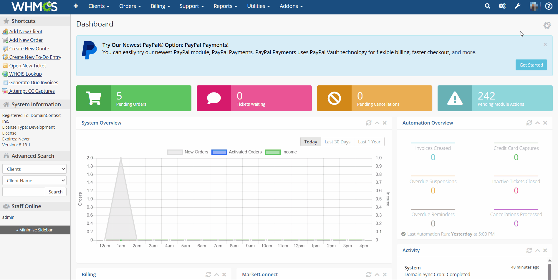 - Log in to WHMCS as an administrator at https://YOUR_DOMAIN/index.php.