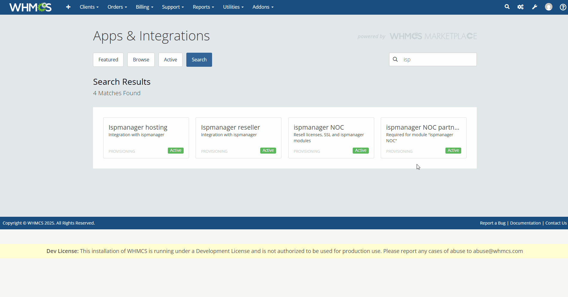 - Search for "ispmanager." The ispmanager NOC module marked as Active should appear on the list.