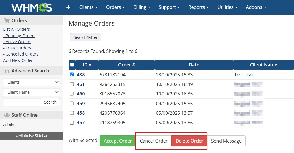 Select the order and click Delete Order to remove it from the list of orders in the WHMCS admin and customer areas.