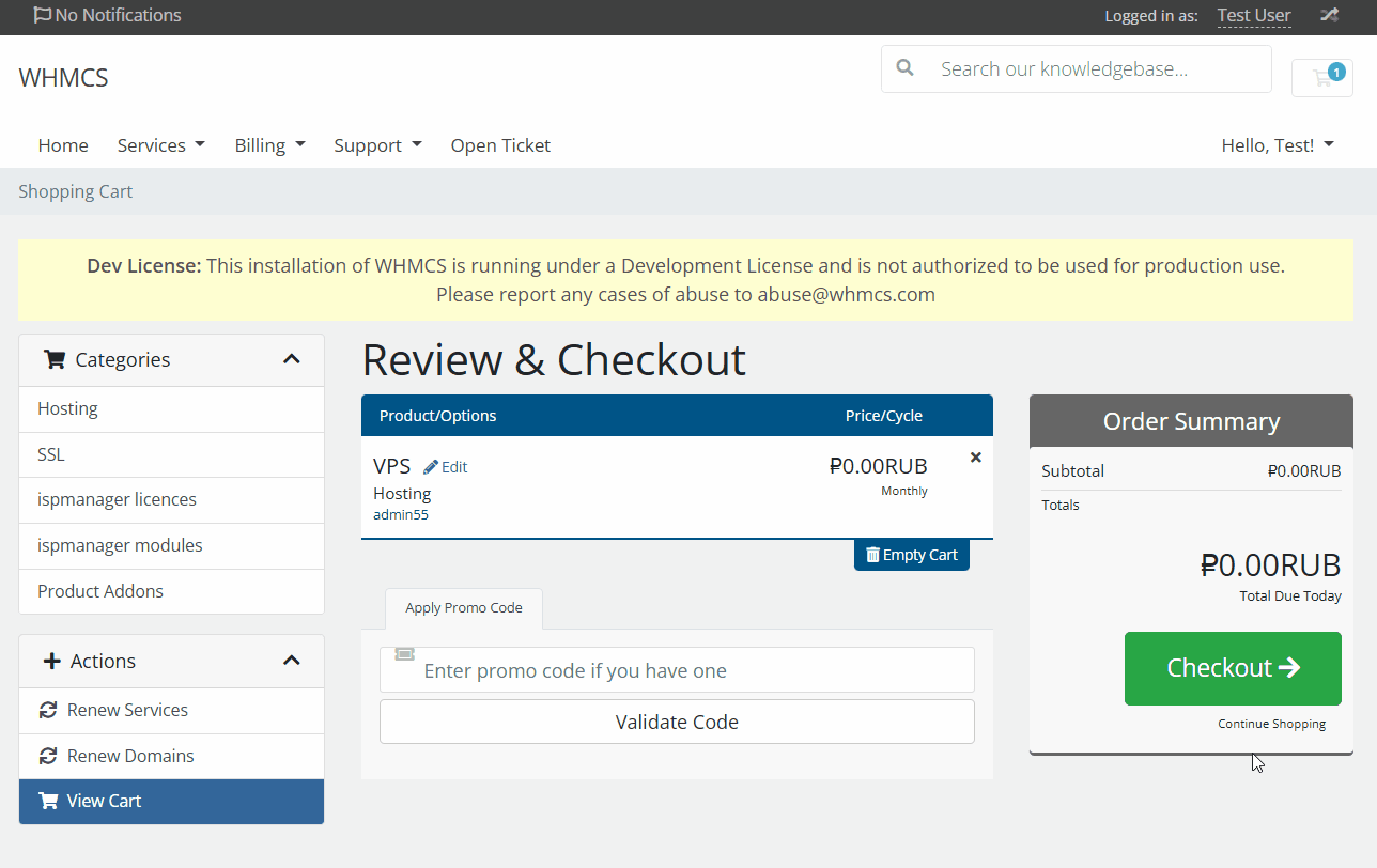 Log in to WHMCS using a test client account at https://YOUR_DOMAIN/index.php or create a new account.