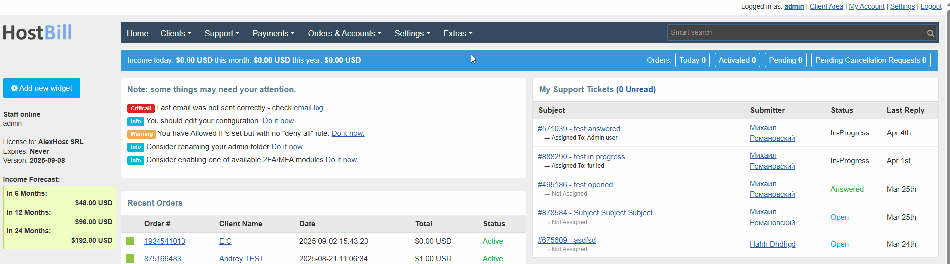 - Log in to HostBill with an administrator account at https://YOUR_DOMAIN/admin or via SSH.