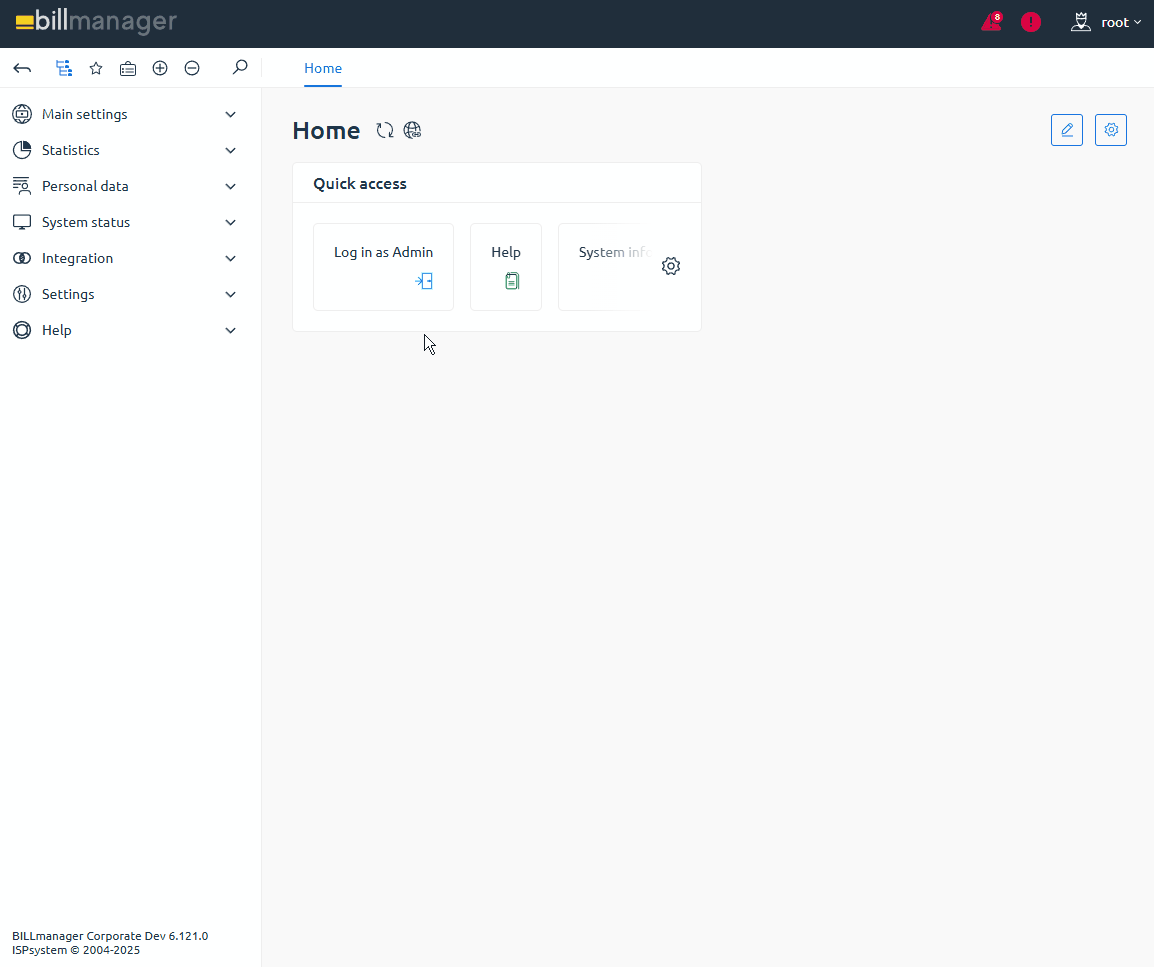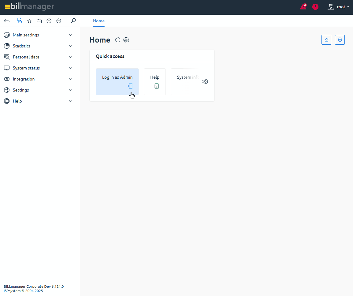 - Log in to BILLmanager as an administrator at https://YOUR_DOMAIN/billmgr.