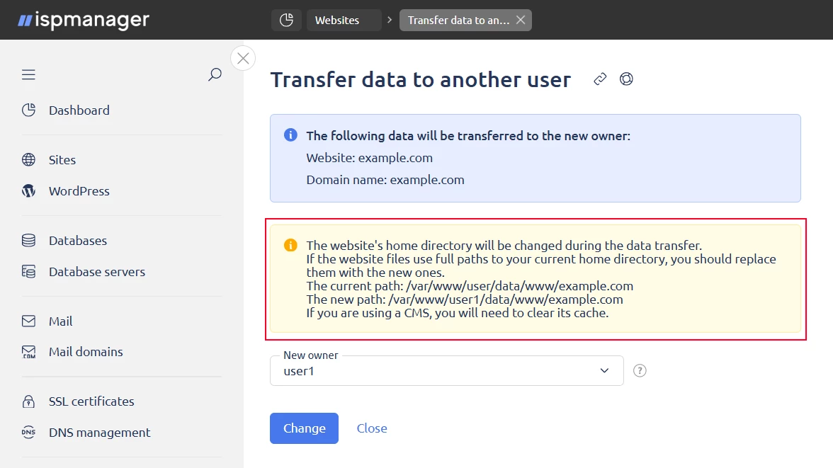 A form with a list of the data to be transferred will open, the current and new path to the site directory, and a list of users to select.
