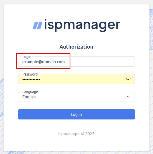 On the ispmanager authorization page, enter the login and password for the required mailbox: