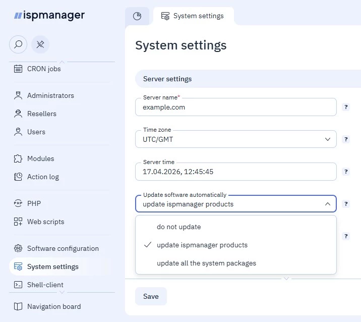 - Update ispmanager products — update automatically ispmanager software products. The system updates only the packages installed from the ispmanager repository. The packages from third-party repositories won't be updated